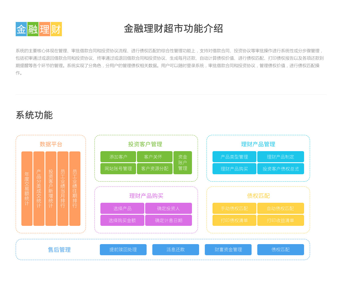 南眾軟件金融理財(cái)超市是針對(duì)已有線下財(cái)富管理、理財(cái)管理業(yè)務(wù)的企業(yè)專門(mén)整合開(kāi)發(fā)的一套互聯(lián)網(wǎng)金融拓展業(yè)務(wù)系統(tǒng),可以將線下財(cái)富管理轉(zhuǎn)換或延伸至線上開(kāi)展,將線下及線上理財(cái)整合在一起管理。系統(tǒng)主要包含借貸中心子系統(tǒng) 、財(cái)富管理子系統(tǒng)、互聯(lián)網(wǎng)金融子系統(tǒng)及網(wǎng)站運(yùn)營(yíng)管理子系統(tǒng)四大類。能夠快速提高理財(cái)顧問(wèn)的服務(wù)能力和銷售效率,改善銷售過(guò)程的合規(guī)程度,增加企業(yè)業(yè)務(wù)收入,降低業(yè)務(wù)風(fēng)險(xiǎn)。